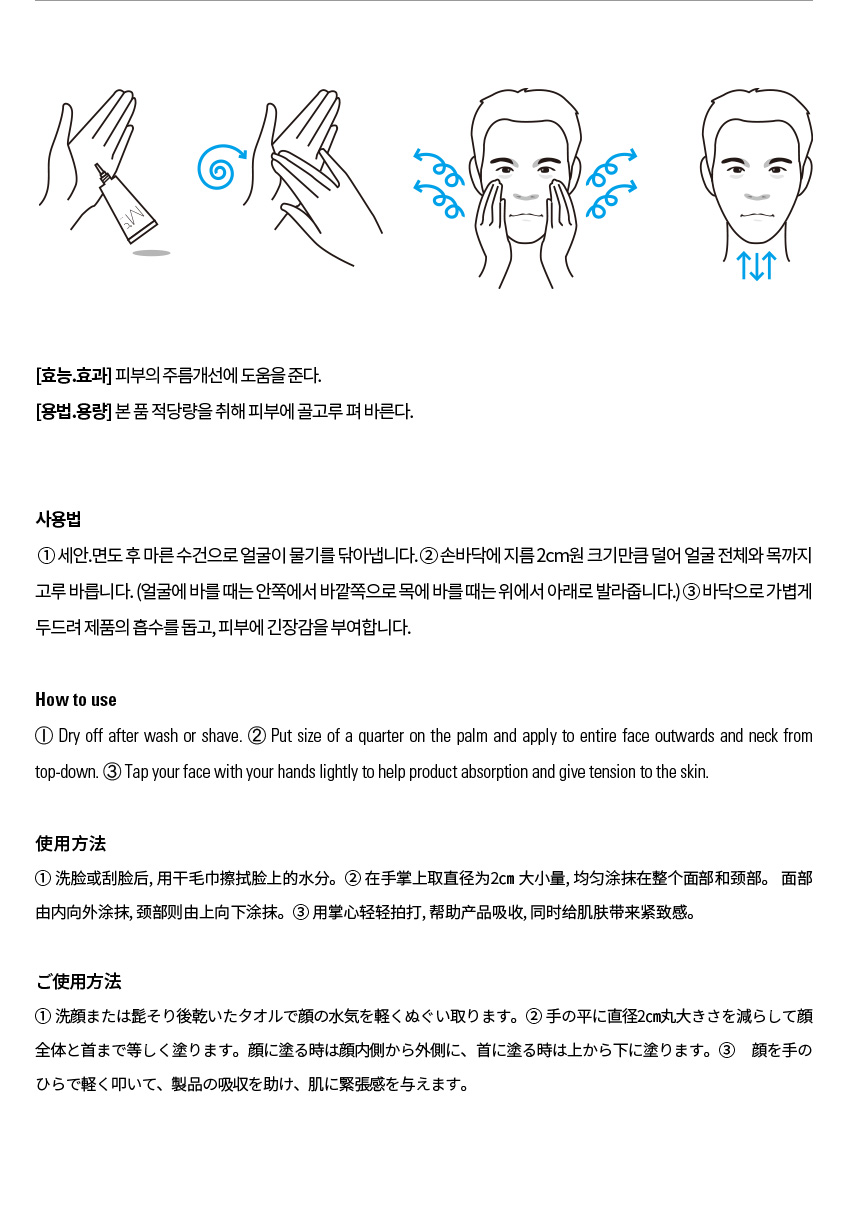 ②손바닥에 지름 2cm원 크기만큼 덜어 얼굴 전체와 목까지 고루 바릅니다. (얼굴에 바를 때는 안쪽에서 바깥쪽으로 목에 바를 때는 위에서 아래로 발라줍니다.)