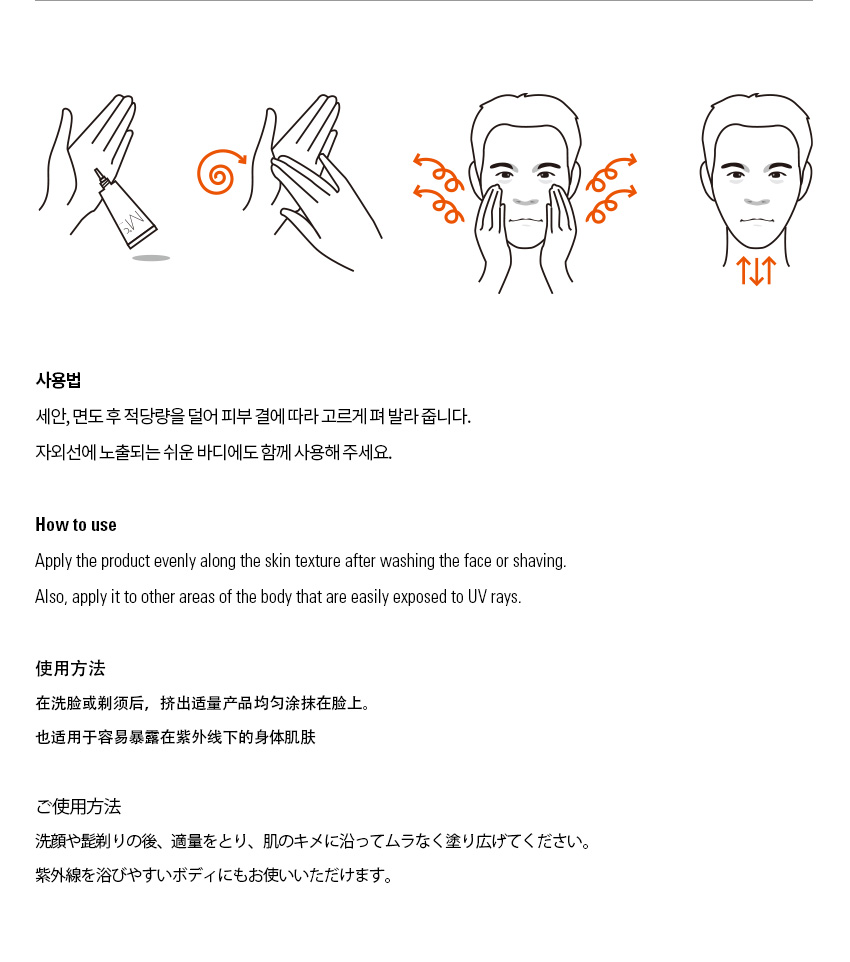 세안, 면도 후 적당량을 덜어 피부 결에 따라 고르게 펴 발라 줍니다.