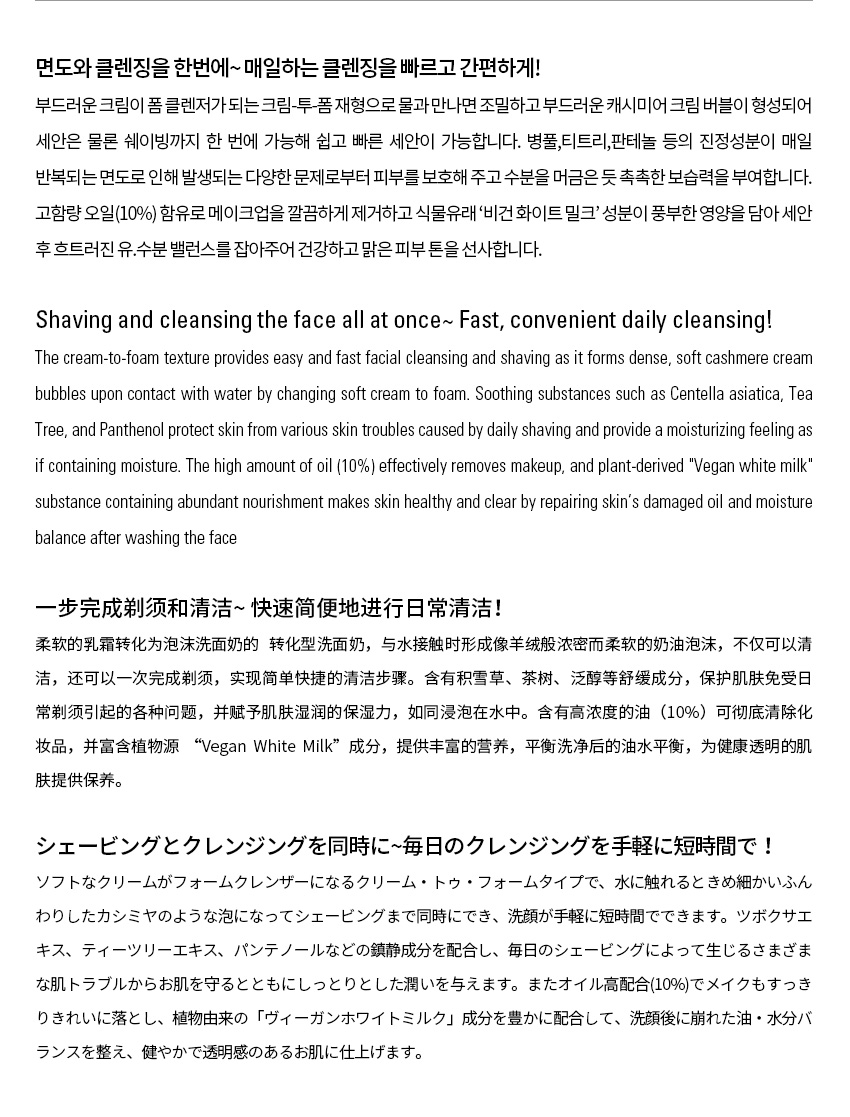 부드러운 크림 거품, 면도와 세안을 한 번에~! 원스텝 클렌징 300ml 대용량 비건 인증 제품